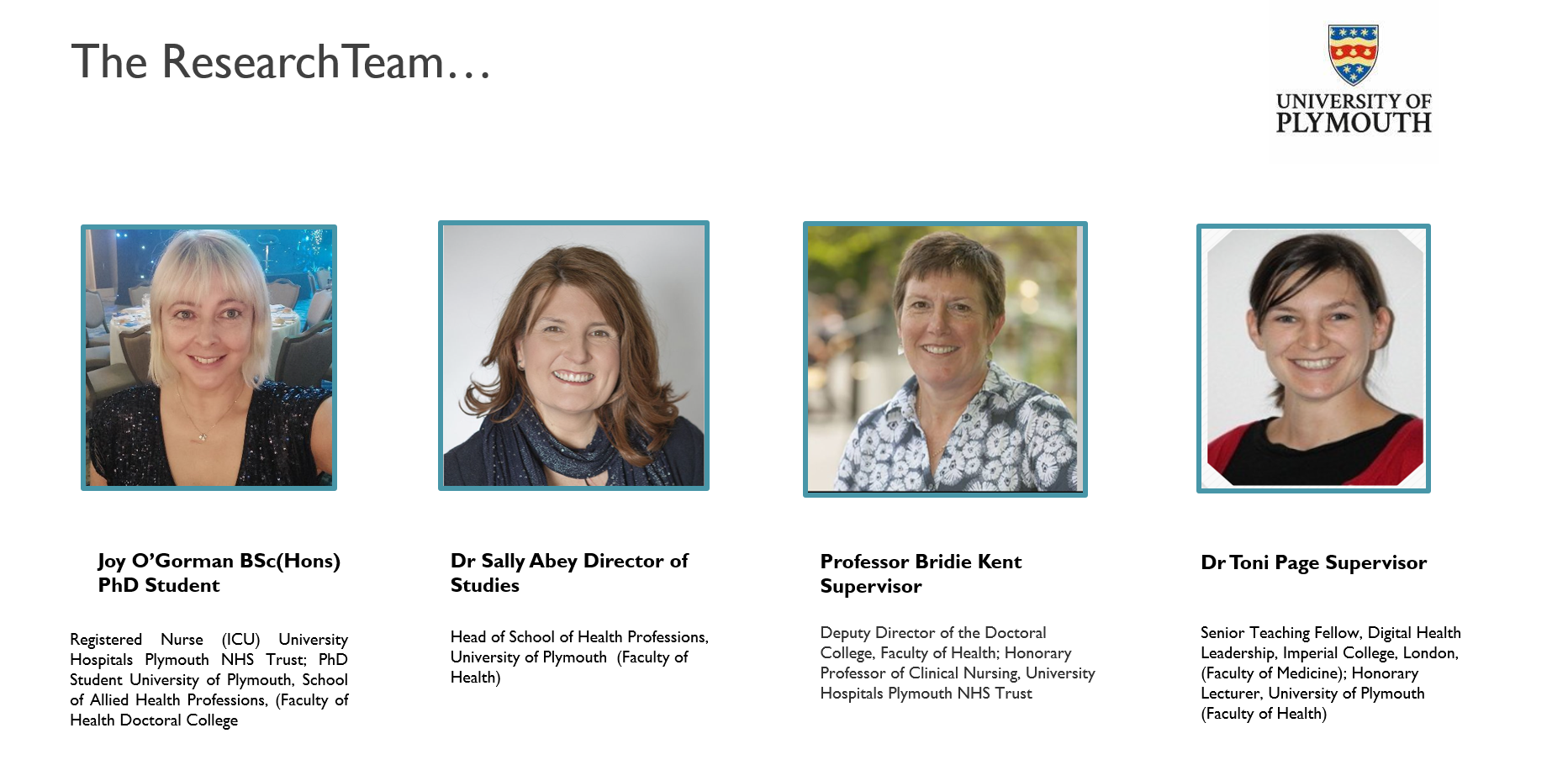 Joy currently works as an Intensive Care Registered Nurse and holds a PhD scholarship with the University of Plymouth.